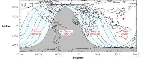 El siguiente mapa muestra las regiones desde las cuales fue visible el eclipse. En gris, las zonas que no vieron el eclipse; en blanco, las que si lo vieron; y en celeste, las regiones que observaron el eclipse durante la salida o puesta de la luna.