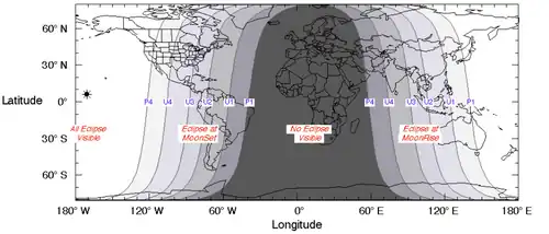 En América del Sur la luna se pone antes de la fase total. En la costa este de América del Norte y en Centroamérica la Luna se oculta en la fase máxima del eclipse.