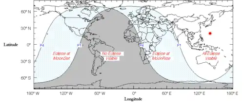El siguiente mapa muestra las regiones desde las cuales será posible ver el eclipse. En gris, las zonas que no observarán el eclipse; en blanco, las que si lo verán; y en celeste, las regiones que podrán ver el eclipse durante la salida o puesta de la luna.