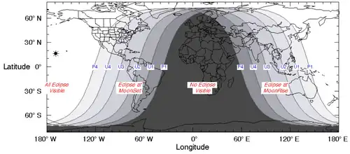 El eclipse fue completamente visible sobre el Pacífico y la mayor parte de América del Norte. Se vio durante la salida de la Luna en Australia, Asia y en el extremo noreste de Europa, y durante la puesta de la Luna en América del Sur y el este de América del Norte.