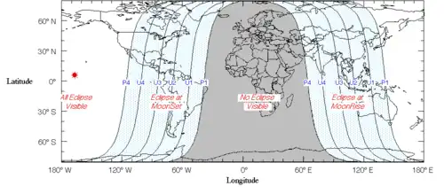 El siguiente mapa muestra las regiones donde se mostrara el eclipse. en blanco, las que si lo vieron; y en celeste, las regiones que pudieron ver el eclipse durante la salida o puesta de la luna.