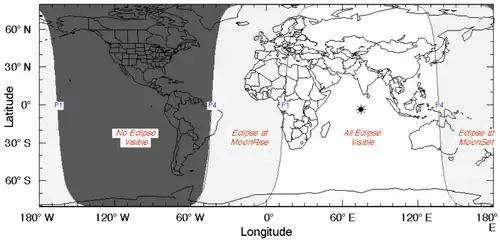 El eclipse fue completamente visible sobre el este de África, el este de Europa, Asia y el oeste de Australia, se vio elevarse sobre el oeste de África y Europa occidental y ponerse sobre el este de Australia y el oeste del Océano Pacífico.[3]