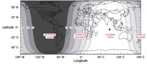 El siguiente mapa de visibilidad muestra las zonas en las que el eclipse podrá ser visto. En color blanco se encuentran las regiones en las que el eclipse es visible de principio a fin; las bandas grises representan las zonas en las que el eclipse coincide con la salida o puesta de la Luna; el área más oscura en donde la Luna permanece debajo del horizonte durante el evento.