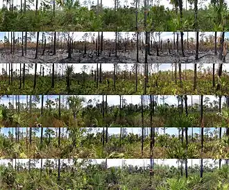 Gran parte del sureste de los Estados Unidos alguna vez fue un bosque abierto de pinos de hoja larga con un rico sotobosque de pastos, juncos, plantas carnívoras y orquídeas. Estos ecosistemas tuvieron la mayor frecuencia de incendios de cualquier hábitat, una vez por década o menos. Sin fuego, los árboles del bosque caducifolio invaden, y su sombra elimina tanto los pinos como el sotobosque. Algunas de las plantas típicas asociadas con el fuego incluyen la planta de jarra amarilla y la rosa pogonia. La abundancia y diversidad de tales plantas está estrechamente relacionada con la frecuencia de los incendios. Los animales raros, como las tortugas terrestres y las serpientes índigo, también dependen de estos pastizales abiertos y bosques planos.[46] Por lo tanto, la restauración del fuego es una prioridad para mantener la composición de especies y la diversidad biológica.[47]