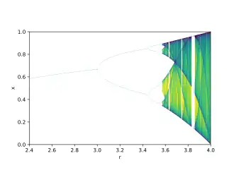 La teoría de la bifurcación se usa para ilustrar cómo pequeños cambios en los valores de los parámetros pueden dar lugar a resultados a largo plazo dramáticamente diferentes, un hecho matemático que puede usarse para explicar las diferencias ecológicas drásticas que se producen en sistemas cualitativamente muy similares.[9] Los mapas logísticos son mapeos polinomiales y, a menudo, se citan como ejemplos arquetípicos de cómo el comportamiento caótico puede surgir de ecuaciones dinámicas no lineales muy simples. Los mapas fueron popularizados en un artículo fundamental de 1976 por el ecologista teórico Robert May.[10] La ecuación de diferencia está destinada a capturar los dos efectos de la reproducción y el hambre.