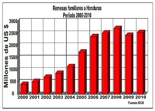 En la actualidad Honduras depende mucho de las remesas, tanto que estas representan alrededor del 25 % del producto interno bruto (PIB) y en los últimos años se han constituido en uno de los principales sustentos de muchas familias hondureñas.[20]