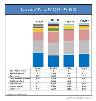 - Subsidio de interés sobre préstamos educacionales Stafford[78] o Perkins (U.S. Department of Education): $11,7 millones (2010)
