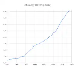 El consumo medio de combustible de las nuevas aeronaves se redujo en un 45% entre 1968 y 2014, lo que supone una reducción anual compuesta del 1,3% con una tasa de reducción variable. En 2018, las emisiones de CO₂ ascendieron a 747 millones de toneladas para el transporte de pasajeros, para 8,5 billones de ingresos por pasajeros (RPK), lo que supone una media de 88 gramos de CO₂ por RPK.[2] Un 88g de CO₂/km representa 3,1 g de combustible por km, o un 3,5l/100 km de consumo de combustible.