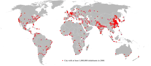 Megaciudades. Áreas urbanas con al menos un millón de habitantes en 2006. El 3% de la población mundial vivía en ciudades en 1800, llegando al 47% a fines del siglo XX.