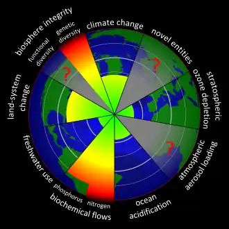 Los límites planetarios de acuerdo con Rockström et al. 2009.[2] Las áreas verdes representan actividades humanas que están dentro de márgenes seguros, las áreas amarillas representan actividades humanas que pueden o no haber excedido márgenes seguros, las áreas rojas representan actividades humanas que han excedido márgenes seguros, y las áreas grises con signos de interrogación rojos representan actividades para las que aún no se han determinado los márgenes de seguridad