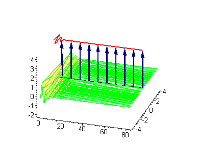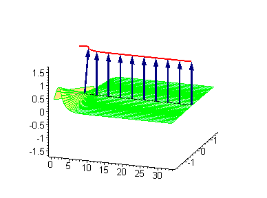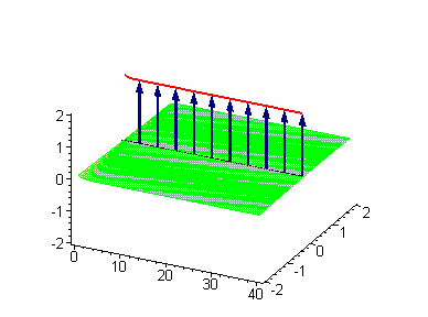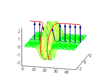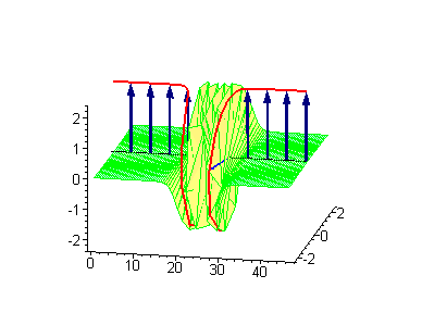 donde es la velocidad del pliegue y es la frecuencia del breather.[10] Si la posición del breather estacionario antes de la colisión es , después de la colisión será .