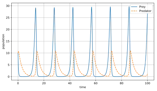 Supongamos que hay dos especies de animales, un babuino (presa) y un guepardo (depredador). Si las condiciones iniciales son 10 babuinos y 10 guepardos, se puede trazar la progresión de las dos especies a lo largo del tiempo; dados los parámetros de que las tasas de crecimiento y muerte de los babuinos son 1,1 y 0,4 mientras que las de los guepardos son 0,1 y 0,4 respectivamente. La elección del intervalo de tiempo es arbitraria.