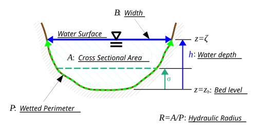 La pendiente del lecho S(x), la pendiente de fricción Sf(x, t) y el radio hidráulico R(x, t) se definen como: y