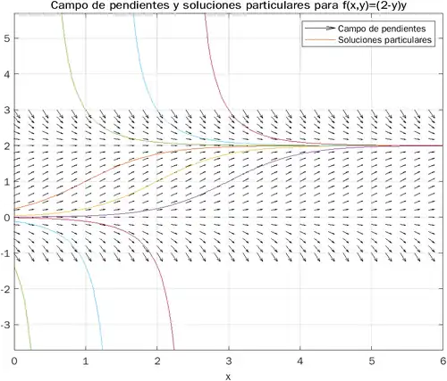 title('Campo de pendientes y soluciones particulares para f(x,y)=(2-y)y')