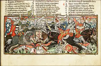 La Edad Media o el Medievo[1] es el período histórico de la civilización occidental comprendido entre los siglos v y xv, sucesor de la Edad Antigua y predecesor de la Edad Moderna. Convencionalmente, su inicio se sitúa en el año 476 con la caída del Imperio romano de Occidente y su fin en 1492 con el descubrimiento de América,[2] o en 1453 con la caída de Constantinopla, fecha que tiene la singularidad de coincidir con la invención de la imprenta —publicación de la Biblia de Gutenberg— y con el fin de la guerra de los Cien Años entre Francia e Inglaterra. Con esto dicho, considerando la caída del Imperio romano de Occidente hasta el descubrimiento de América, la Edad Media abarcó un periodo de 1016 años.