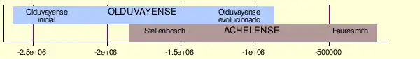 - Olduvayense: Así llamado por haber sido identificado en el yacimiento de la garganta de Olduvai, al que acompañan otros muchos lugares, casi todos ellos alineados con el Valle del Rift. Las herramientas olduvayenses más antiguas podrían tener más de 2,6 Ma (en los yacimientos del Afar etíope[13]), existiendo una secuencia de hallazgos en toda África Oriental y Austral desde esa fecha hasta hace 1,5 Ma, sin hiatos ni vacíos, por lo que es posible defender que el Olduvayense pervivió por más de un millón de años (es posible que incluso más, si se amplia la cronología con ciertos yacimientos más tardíos). El Olduvayense se divide en una fase inicial y otra evolucionada, identificadas a partir de los lechos I y II de la garganta de Olduvay, aunque hay otros muchos yacimientos igual de importantes. Al principio, las herramientas son de piedra tallada toscamente, sin que se aprecie ninguna estandarización en las tácticas de aprovechamiento ni en las formas. Pero poco a poco, van cristalizando determinados procedimientos y tipos concretos entre los que destacan cantos tallados, poliedros, raederas y denticulados. Es de suponer que existió una industria en madera o en hueso, pero no se ha conservado en las mismas condiciones. Los protagonistas de este vasto complejo cultural fueron varias especies del género Homo (H. habilis, H. rudolfensis y formas tempranas de H. erectus, científicamente desglosadas en la especie H. ergaster). Todos ellos parecen haber sido cazadores solo en raras ocasiones, dedicándose, más bien, a la recolección y al carroñeo; conocían pero no dominaban el fuego, y ya se les atribuyen algunas estructuras de construcción sencilla para protegerse.[14]