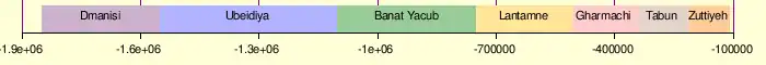 - Paleolítico Inferior: La secuencia inferopaleolítica del Medio Oriente parece muy temprana, habiéndose constatado el paso del ser humano por la zona gracias al hallazgo de los restos de Dmanisi (Georgia). Se trata, probablemente de Homo ergaster, en concreto, varios cráneos de entre 1 850 000 y 1 600 000 años de antigüedad[20] que van acompañados de una cultura material muy tosca (lascas, cantos tallados y núcleos de extracciones desorganizadas[21]). Se trataría pues de un Paleolítico Inferior Arcaico, anterior al Achelense.