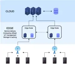 De manera similar, el objetivo del procesamiento perimetral es mover la computación desde los centros de datos hacia el perímetro de la red, explotando objetos inteligentes, teléfonos móviles o puertas de enlace de red para realizar tareas y brindar servicios en nombre de la nube.[18] Al mover los servicios al perímetro, es posible proporcionar almacenamiento en caché de contenido, entrega de servicios, almacenamiento y administración de IdC, lo que da como resultado mejores tiempos de respuesta y tasas de transferencia. Al mismo tiempo, distribuir la lógica en diferentes nodos de red presenta nuevos problemas y desafíos que la computación tradicional no ha logrado vencer.