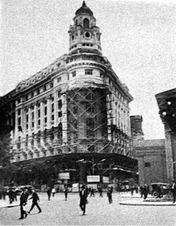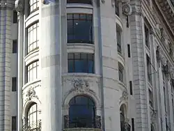 Posee dos subsuelos, planta baja y 8 pisos altos, con una torre que en su cúpula posee una linterna a 56 metros de altura. Es de estilo academicista francés y está profusamente ornamentado, destacándose su ochava cilíndrica en el cruce de la Diagonal Norte (avenida Presidente Roque Sáenz Peña) y la calle San Martín, adornada con pilastras de orden jónico, al igual que el resto de la fachada.