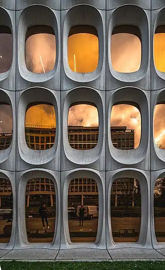 Su fachada modular prefabricada exhibe hormigón blanco en lugar de ocultarlo como material de construcción, clasificando el edificio como una pieza de arquitectura brutalista.[2][3]