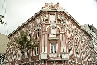 El edificio es de planta cuadrada ubicado en la esquina de una manzana, posee un acceso lateral a un patio central cubierto, rodeado por un corredor con columnas, por él se accede a oficinas que dan a la calle y otras laterales, escaleras y al cuarto nivel. Constructivamente la fachada y muros interiores son en mampostería, estructura en concreto armado, el entrepiso en placa y madera, cubierta en placa de concreto (terraza) y fibrocemento, marquesina en estructura metálica. Posee algunos frescos (pinturas) en el interior descubiertos y semidestruidos, obra de Colombo Ramelli, quien igualmente remató el ochavado con un frontón circular interrumpido, con las dos esculturas en mármol de Carrara que representan a Minerva y Mercurio.