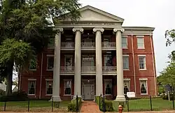 La estructura de ladrillo rojo de tres pisos está construida en el estilo neogriego que era popular en el momento de su construcción. Es más notable por su pórtico tetrástilo ubicado en el centro, que utiliza columnas jónicas monumentales. La mampostería a la vista de la fachada de siete bahías utiliza la unión de la camilla, con una hilera de cinturón entre cada piso. El pórtico con frontón cubre las tres bahías centrales, con balcones en cada nivel superior que se extienden a lo ancho y a la profundidad del área cubierta. Las barandas de hierro forjado del balcón utilizan un diseño con un patrón de diamante abierto, también conocido como balaustre de pata de gallo.[3]