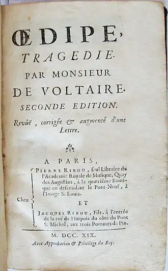 Edipo (Œdipe, en francés) es una obra de teatro de Voltaire, que se representó en 1718, de un valor literario bastante relativo, ya que simplemente retoma el mito de Edipo, sin añadir nada que pueda considerarse realmente nuevo, y cuyo mayor valor es que trata de recuperar la sencillez griega. Se centra principalmente en el amor de Edipo hacia Yocasta.