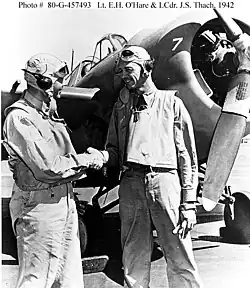 Su vuelo más famoso ocurrió durante la Guerra del Pacífico el 20 de febrero de 1942. El teniente O'Hare y su ayudante eran los únicos combatientes de la Marina disponibles cuando una segunda ola de bombarderos japoneses atacaban a su portaaviones Lexington .