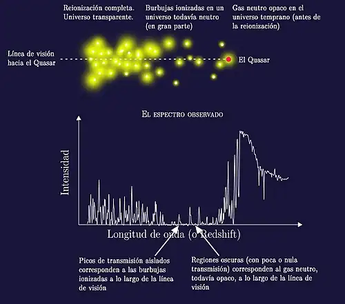 - ↑ Becker, R. H.; etal (2001). «Evidencia para reionización en z ~ 6: Detección de un canal de Gunn-Peterson en un z = 6.28 Cuásar». Astronomical Journal 122: 2850-2857. Bibcode:.... 122.2850B 2001AJ .... 122.2850B. arXiv:/ 0108097 astro-ph / 0108097. doi:10.1086/324231. Parámetro desconocido