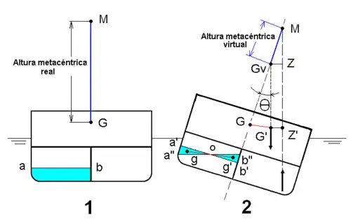 Entonces se ve claramente que acción o efecto de una superficie libre genera la elevación virtual del centro de gravedad con la consiguiente pérdida de estabilidad.