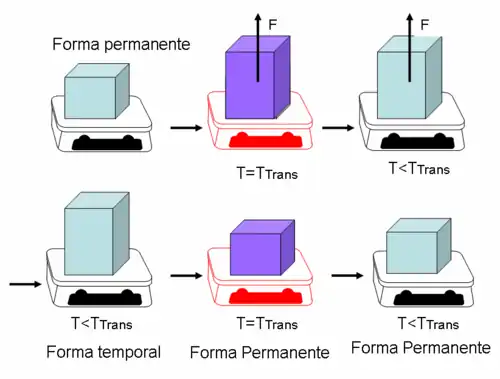 - 2. Se programa el sistema, es decir se calienta hasta TTrans y a esa temperatura es modificada la forma aplicando presión o estrés. Luego es enfriado el material y finalmente la presión o el estrés es eliminado.