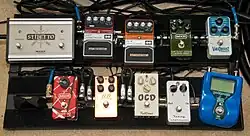 - Pedal analógico: O "stomp box" en inglés, consiste en un circuito electrónico dentro de una caja compacta y normalmente metálica, que se enciende o apaga con un botón. El circuito incluye potenciómetros para modificar los parámetros de éste. Son ideales para tocar en vivo, pues el guitarrista solo pulsa el botón con el pie, siguiendo con las manos libres para ejecutar. En efecto, varios pedales analógicos interconectados entre sí modificarán aún más la señal de entrada, pero el sonido final dependerá del orden en que se dispongan los efectos de la cadena, incluyendo la etapa previa y de potencia del amplificador -gracias al sistema de válvulas y/o transistores-. Este factor es utilizado y aprovechado por muchos guitarristas experimentados, como Tom Morello. El conjunto de pedales se denomina comúnmente "pedalboard".