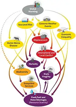 - ↑ a b c d e f g h Cissé, G., R. McLeman, H. Adams, P. Aldunce, K. Bowen, D. Campbell-Lendrum, S. Clayton, K.L. Ebi, J. Hess, C. Huang, Q. Liu, G. McGregor, J. Semenza, and M.C. Tirado, 2022: Chapter 7: Health, Wellbeing, and the Changing Structure of Communities. In: Climate Change 2022: Impacts, Adaptation and Vulnerability. Contribution of Working Group II to the Sixth Assessment Report of the Intergovernmental Panel on Climate Change [H.-O. Pörtner, D.C. Roberts, M. Tignor, E.S. Poloczanska, K. Mintenbeck, A. Alegría, M. Craig, S. Langsdorf, S. Löschke, V. Möller, A. Okem, B. Rama (eds.)]. Cambridge University Press, Cambridge, UK and New York, NY, USA, pp. 1041–1170, doi:10.1017/9781009325844.009.