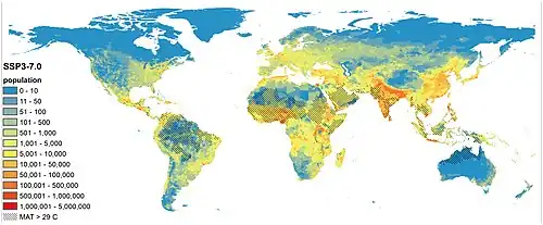 Un estudio de 2020 proyecta que las regiones habitadas por un tercio de la población humana podrían llegar a ser tan cálidas como las partes más cálidas del Sahara dentro de 50 años sin un cambio en los patrones de crecimiento demográfico y sin migración, a menos que se reduzcan las emisiones de gases de efecto invernadero. La temperatura media anual proyectada por encima de los 29 °C para estas regiones estaría fuera del "nicho de temperatura humana" -un rango sugerido para el clima biológicamente adecuado para los humanos basado en datos históricos de temperaturas medias anuales (MAT), y las regiones más afectadas tienen poca capacidad de adaptación a partir de 2020.[21][22] La Oficina Nacional de Meteorológía del Reino Unido llegó a conclusiones similares, informando que "el número de personas en regiones de todo el mundo afectadas por estrés por calor extremo -una combinación potencialmente mortal de calor y humedad- podría aumentar" "de 68 millones en la actualidad a alrededor de mil millones" si el aumento de la temperatura mundial alcanza los 2 °C,[23] aunque no está claro si se logra ese límite o el objetivo de 1,5 °C del Acuerdo de París.