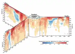 La mayor parte del aumento de calor del océano ha ocurrido en el Océano Austral. Por ejemplo, entre los años 1950 y 1980, la temperatura del Océano Antártico Austral aumentó alrededor de 0.17 °C (0.31 °F), casi el doble de la tasa del océano global.[11]