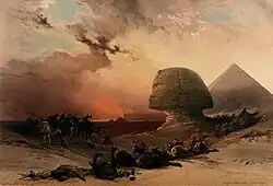 ![]() «Acercamiento del simún, desierto de Guiza» (1846–49), litografía de Louis Haghe en The Holy Land, Syria, Idumea, Arabia, Egypt, and Nubia por David Roberts, presentada en la portada de la edición francesa, y de la primera edición en castellano. | |||||