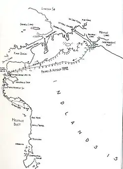 El 3 de mayo, Peary y Henson comenzaron una expedición en trineos tirados por perros a través del glaciar de Groenlandia, acompañados por Gibson, Astrup y Cook. Las fuentes varían en cuanto al número de perros y la cantidad de equipo, con un peso total entre 800 y 900 kg[1]. Después de despedir a los acompañantes, 450 kg de provisiones y equipo fueron cargados en un gran trineo dirigido por Astrup, tirado por una decena de perros[13]. Peary manejaba un trineo más pequeño y se sentía más seguro con raquetas de nieve que con esquís. Además, él mismo se enganchaba al trineo junto con los perros, que al inicio eran tres. El camino era cuesta arriba continuamente, y el 15 de mayo alcanzaron una altitud de 3500 pies (1070 m). A medida que ganaban habilidad con los perros, aumentaban las distancias diarias recorridas, de 19 a 32 km[14]. El 24 de mayo alcanzaron la desembocadura del glaciar Humboldt, a 210 km de la costa. Aquí, Peary decidió enviar a Cook de vuelta a la base, entregándole la responsabilidad de la expedición durante su ausencia, junto con Gibson y Henson[1]. Continuando, Peary y Astrup mataron al primer perro el 28 de mayo para alimentar a los demás. El 31 de mayo llegaron al glaciar Petermann, donde comenzaba un fiordo de 55 millas que conducía a la cuenca de Hall. Peary decidió cambiar el rumbo hacia el este debido a las grietas en el hielo[15]. Continuaron hacia el este, llegando el 21 de junio al fiordo de Sherard Osborne, y el 26 de junio al fiordo Victoria. No podían avanzar más y debían regresar hacia el sur. El 1 de julio alcanzaron una costa escarpada desde la cual se veía el océano Ártico. Llegaron al borde del hielo continental el 2 de julio por la mañana[16].
