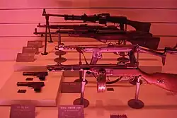 Además, también había una copia local del subfusil Thompson estadounidense producida por la República Popular China, basada en el tipo que ya había sido exportado y utilizado en China desde la década de 1930 y por las tropas de la ONU durante la guerra de Corea. Más tarde, después del primer año de la guerra de Corea, la Unión Soviética comenzó a enviar más armas y municiones a la República Popular China, que comenzó a producir copias con licencia de algunos tipos de armas soviéticas, como el PPSh-41, que fue designada como Tipo 50. Además del excedente de armas soviéticas de la Segunda Guerra Mundial, la Unión Soviética también proporcionó algunas armas pequeñas alemanas de la Segunda Guerra Mundial a los chinos como el rifle Karabiner 98k. Las municiones excedentes de Mauser también fueron suministradas por la Unión Soviética o estaban disponibles en las existencias dejadas por las fuerzas del KMT que también usaron municiones alemanas.[4]