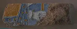 La coraza tampoco es habitual. En ella figuran unos puntos pequeños situados en el centro de rombos, que tal vez representen remaches usados para fijar placas de bronce puestas entre dos capas de cuero, una en el interior y otra en el exterior de la pieza. Las líneas diagonales casi seguro que representan las costuras. Sería el equivalente a la brigantina medieval o renacentista. La parte inferior acaba en una falda de pteruges. Esta prenda parece estar confeccionada de cuero duro, cortada en flecos para no entorpecer el movimiento de los muslos. El pantalón tiene aplicaciones cosidas de un material más oscuro en forma de rombos u hojas de contorno irregular.[45]