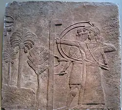 La infantería asiria se componía de dos tipos los asirios nativos y los extranjeros empleados como auxiliares, lanceros, honderos, portadores de escudos o arqueros. Este último tipo era el más dominante en los ejércitos asirios.[20] Desde la época de Asurnasirpal, los arqueros iban acompañados de un escudero, mientras que los honderos tendrían por objetivo distraer al enemigo a bajar su escudo para protegerse de las piedras, lo que permita a los arqueros disparar por encima de los escudos y matar a sus enemigos.[20] Incluso en la guerra de asedio, las flechas se utilizaron para hacer retroceder a los defensores de la pared mientras avanzaban contra las fortificaciones. Muchos tipos distintos de arcos eran utilizados por los asirios, incluyendo el acadio, cimerio y su propio estilo asirio. Sin embargo, lo más probable es que estos eran simplemente diferentes variantes del arco compuesto de gran alcance. Dependiendo del arco, un arquero dispondrá de un rango de entre 250 a 650 metros.[20] Grandes cantidades de flechas puede eran gastadas en la batalla como anticipación para la guerra se fabricaban muchas flechas.[20]