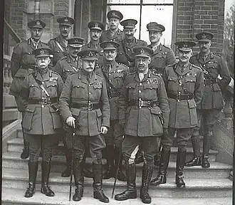 La mayoría de los oficiales de antes de la guerra venían de familias con conexiones militares, de gentry o de la nobleza; una educación de escuela pública era casi esencial.[52] En 1913, cerca del 2% de los oficiales regulares habían sido promovidos.[53] Los cuerpos de oficiales, durante la guerra, consistían en oficiales regulares del ejército de tiempos de paz, oficiales a los que les habían garantizado comisiones permanentes durante la guerra, oficiales a los que se les había garantizado comisiones temporales por lo que durara la guerra, oficiales del ejército territorial durante los tiempos de paz, oficiales comisionados de los rangos de antes de la guerra del ejército regular y territorial y oficiales temporales comisionados de los rangos para la duración de la guerra únicamente.[54]