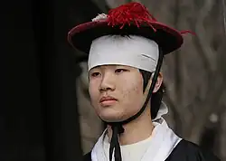 La Guardia Real de la Dinastía Joseon era un grupo de élite de soldados responsables de proteger al Rey y a la familia real y defender el Geumjung (禁裏), la residencia del rey. Sumaban hasta 50-200 hombres encargados de proteger el palacio y escoltar al rey. Se dividieron en varias unidades diferentes, cada una con sus propias responsabilidades específicas. Los Naegeumwi (내금위), los guardias internos que protegían los aposentos del rey y atendían sus necesidades personales, eran elegidos entre los soldados más leales y confiables y estaban altamente capacitados en artes marciales. Los Gyeonggukdae (경국대) eran guardias de élite, responsables de proteger al Rey y al palacio real. También eran responsables de mantener el orden y evitar la entrada no autorizada al palacio.[28] Los Gyeomsabok (겸사복) eran los guardias que patrullaban los terrenos del palacio y las murallas exteriores. Eran responsables de mantener el orden y evitar la entrada no autorizada al palacio. Los Woorimwi (우림위) eran los arqueros que custodiaban las puertas del palacio y eran responsables de disparar flechas a cualquier posible intruso. Los Jungrowi (중로위) eran los guardias que escoltaban al rey y otros funcionarios importantes en asuntos oficiales fuera del palacio. En 1666, el rey Hyeongjong estableció el Howechung, un grupo selecto de soldados de élite de la dinastía Joseon que eran responsables de proteger el sello del rey y otros documentos reales importantes.[29] También sirvieron como la unidad de élite del ejército central, ya que los reyes Joseon asignaron una cierta cantidad de unidades para servir en él.[30]