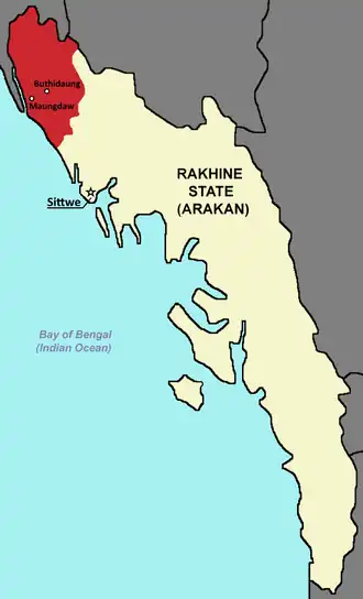 - ↑ «Over 4000 ethnic Rakhine have fled their villages as fighting between terrorists and Tatmadaw». www.mmtimes.com. 29 de agosto de 2017. Archivado desde el original el 1 de septiembre de 2017. Consultado el 31 de agosto de 2017.