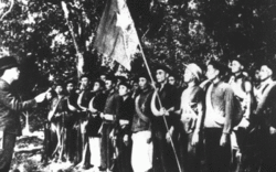 General Võ Nguyên Giáp en la fecha de establecimiento del EPV en 1944.El Jefe de Estado Mayor Hoàng Văn Thái vistiendo un casco de médula y sosteniendo la bandera.