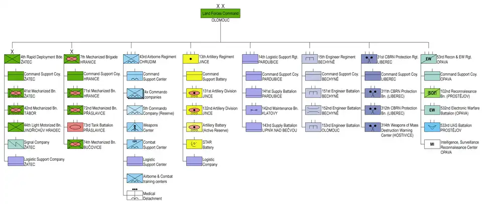 El primero de julio del 2013 se aprobó que el Ejército tuviera un mando e instalaciones diferenciados a los de las Fuerzas Armadas de la República Checa, y así mismo que pasaran a una nueva estructura organizativa dentro de la reforma de las fuerzas armadas.[4] A partir del 1.º de diciembre de 2013 el Ejército de la República Checa pasa de la estructura brigadas de tipos de tropas a la estructura de tipo regimiento. Estos cambios se hacen a respuesta de la reducción en los presupuestos para la defensa. En términos de la cadena de mando se cambiarán las cantidades para guardar los números, en especial en la categoría de oficiales de alto rango.[5] La reestructuración incluye a las fuerzas terrestres en las unidades ofensivas de combate, logística y apoyo de combate y las fuerzas de apoyo en combate:[6]
