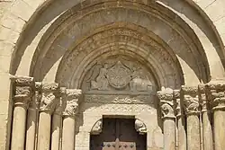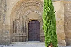 La portada norte, cobijada bajo un pórtico del siglo XVI, contiene un muestrario escultórico románico, uno de los más significativos del taller del Maestro de Agüero. La portada oeste, del mismo taller, contiene un tímpano central, con el crismón trinitario aragonés sustentado por dos ángeles.