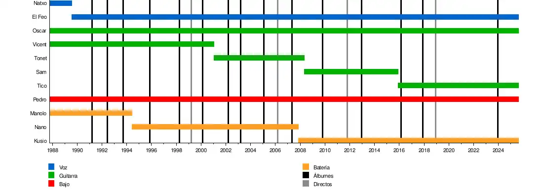 Aunque la formación inicial era Pedro (bajo), Vicent (guitarra), Oscar (guitarra), Natxo (voz) y Manolo (batería), esta cambió antes de grabar su primer disco con la marcha de Nacho y la llegada de El Feo. En 1991 vio la luz su primer LP, No soporto vuestras caras, en 1992 salió "Soldadito Español" y en 1993 fue "Que se repartan el mundo".