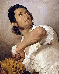 Una inscripción en el reverso del lienzo en italiano indica que se trata del: «Retrato del famoso jugador Domenico Marini, pintado por Karl Briulov, pintor ruso que vivió en Roma en 1829». Magdalena Rakova señala que la figura del padre que protege a su familia con su capa debe, según la intención de Briulov, ser tomada en un rápido movimiento. Sin embargo, en el lienzo parece petrificada y en una posición de pie inestable. El hombre es representado de pie sobre su pierna derecha, como si siguiera corriendo, justo después de pasar sobre el cuerpo de una mujer en el suelo. Pero todavía parece inmóvil como los otros miembros de su familia.[168]