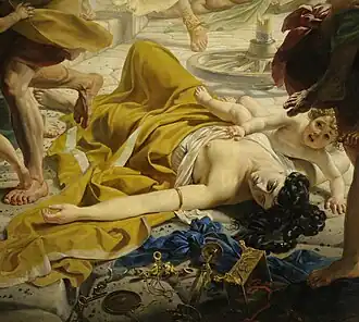 La crítica de arte Magdalena Rakova destaca la sencillez de la composición y la claridad del conflicto psicológico de este grupo madre-hijas. Según ella, este grupo se construye como un triángulo isósceles típico de la composición clasicista, logrado de manera magistral sin sacrificar la precisión de los bordes del triángulo. La unificación de este grupo se logra mediante el amplio y tierno gesto de la madre de abrazar a sus hijas con sus manos. El movimiento se cierra con la mano izquierda de la niña abrazando a la hermana menor.[171] Rakova también subraya la similitud de este grupo con el antiguo motivo de Níobe (hija de Foroneo) y sus hijos heridos con flechas por Artémisia —Diana en la mitología romana— y Apolo.[172] (Diana y Apolo atravesando a los hijos de Níobe con sus flechas)