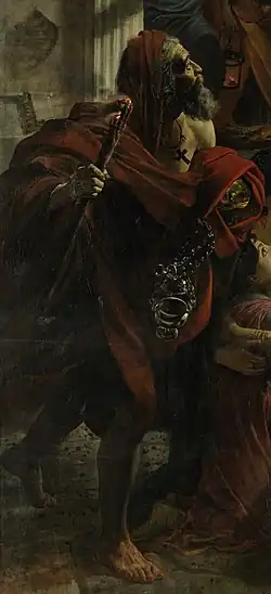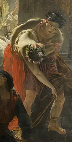 En una carta a su hermano Teodoro, Karl Briulov describe la representación del sacerdote pagano de la siguiente manera: «A la derecha de la mujer que cayó en el camino, un sacerdote quita objetos de culto y sacrificio cubriéndose la cabeza y corriendo en una dirección indeterminada....».[156][160] En las primeras composiciones, Briulov había colocado el personaje de este sacerdote en los escalones del sepulcro, y luego lo había movido a la derecha. En los últimos bocetos, este sacerdote está más representado en el fondo. Su figura pierde así la importancia que tuvo en las primeras variantes de la composición.[155]